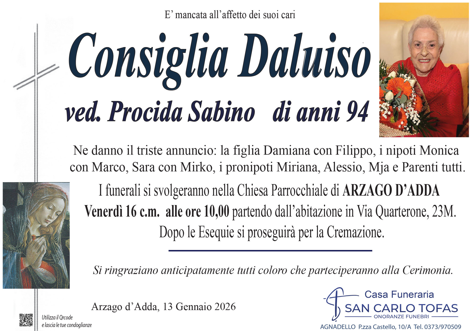 I funerali si svolgeranno nella Chiesa Parrocchiale di ARZAGO D’ADDA