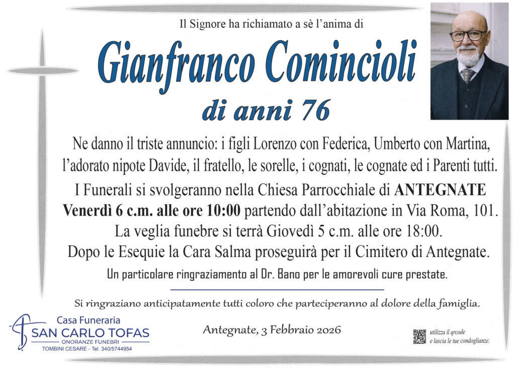 La veglia funebre si terrà Giovedì 5 c.m. alle ore 18:00.