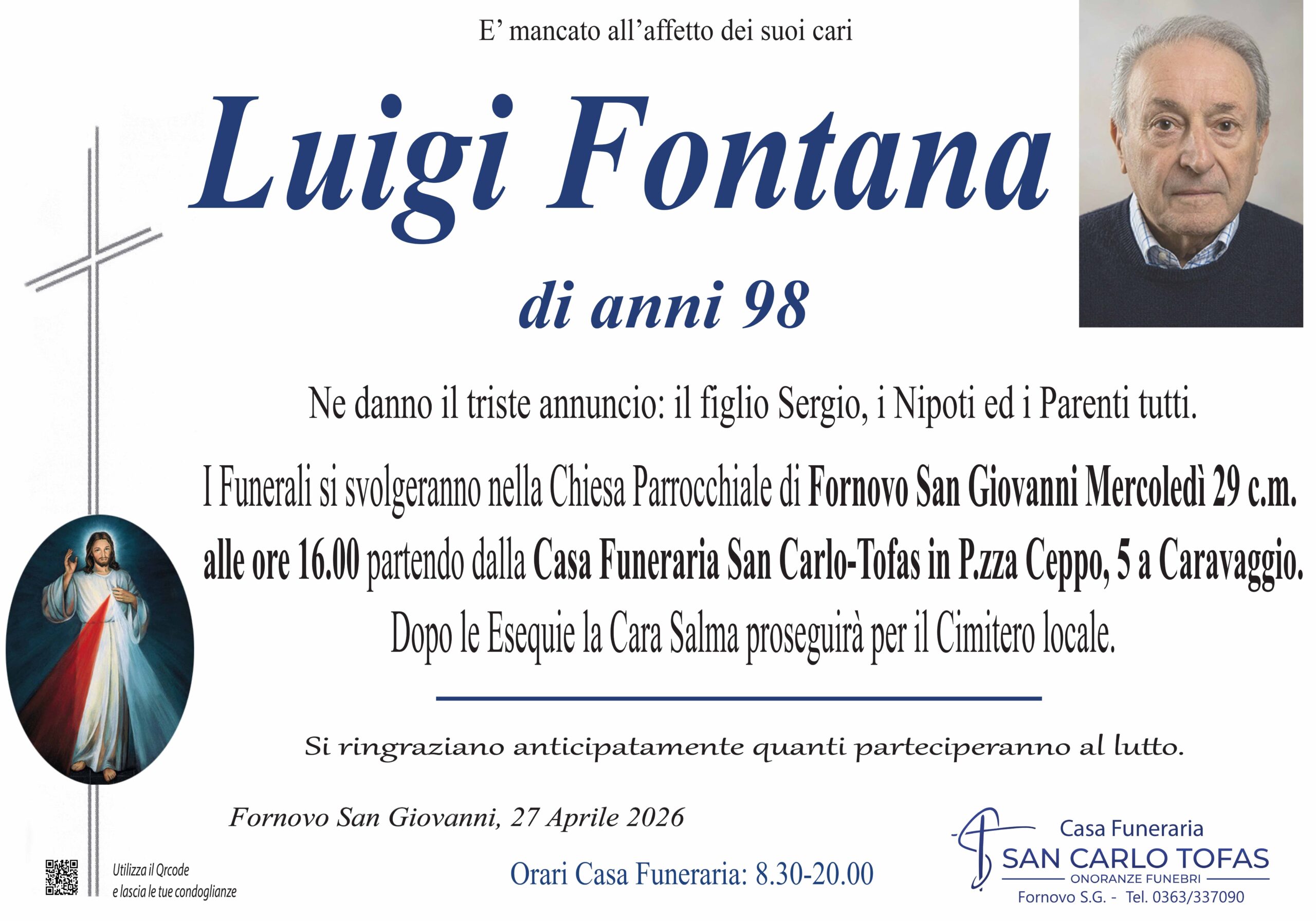 I Funerali si svolgeranno nella Chiesa Parrocchiale di Fornovo San Giovanni Mercoledì 29 c.m.